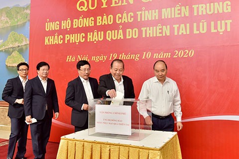 สิ่งที่น่าสนใจคือในช่วงก่อนและในขณะที่เกิดเหตุอุทกภัยในภาคกลาง พรรคและรัฐบาลได้ทำการชี้นำงานด้านการป้องกัน รับมือและแก้ไขผลเสียหายอย่างทันการณ์ โดยเมื่อวันที่ 16 ตุลาคม เลขาธิการกลางพรรคฯได้ส่งโทรเลขชี้นำงานด้านการป้องกัน รับมือและลดความเสียหายจากเหตุน้ำท่วมและฝนตกหนักในจังหวัดต่างๆทางภาคกลาง ต่อมาเมื่อวันที่ 18 ตุลาคม นายกรัฐมนตรีได้ส่งโทรเลข 1411 เกี่ยวกับการช่วยเหลือและแก้ไขผลเสียหายจากปัญหาดินถล่มบริเวณโรงไฟฟ้าพลังงานน้ำหร่าวจังหมายเลข 3 ในจังหวัดเถื่อเทียนเว้และคณะกรรมการเศรษฐกิจ-กลาโหม 337 ของกองทัพภาคที่ 4 ในจังหวัดกว๋างจิ และเมื่อวันที่ 19 ตุลาคม ได้มอบหมายให้กระทรวงการคลังแจกจ่ายข้าว 5 พันตันจากคลังสำรองแห่งชาติให้แก่จังหวัดกว๋างบิ่ง กว๋างจิ เถื่อเทียนเว้ กว๋างนามและห่าติ๋ง จังหวัดละ 1 พันตันเพื่อช่วยเหลือประชาชนที่ประสบภัย เมื่อเร็วๆนี้ นายกรัฐมนตรียังได้อนุมัติเงิน 5 แสนล้านด่งจากงบประมาณสำรองส่วนกลางปี 2020 ให้แก่ 5 จังหวัดทางภาคกลางเพื่อปฏิบัติงานด้านช่วยเหลือผู้ประสบภัย ส่วนบรรดาผู้นำพรรคและรัฐได้ลงพื้นที่จังหวัดทางภาคกลางเพื่อตรวจสอบและชี้นำงานด้านการป้องกันและรับมือเหตุอุทกภัย อีกทั้งให้กำลังใจและมอบสิ่งของช่วยเหลือให้แก่ประชาชน เมื่อวันที่ 24 ตุลาคม นายกรัฐมนตรีได้ลงพื้นที่จังหวัดกว๋างบิ่งเพื่อตรวจสอบงานด้านการแก้ไขผลเสียหายจากเหตุน้ำท่วม ส่วนในการประชุมกับท้องถิ่นต่างๆเพื่อชี้นำการรับมือพายุโมลาเบผ่านวิดีโอคอนเฟอเรนซ์เมื่อวันที่ 26 ตุลาคม นายกรัฐมนตรีได้ชี้นำให้กระทรวง หน่วยงานส่วนกลางและท้องถิ่นระงับการประชุมที่ไม่จำเป็นเพื่อทุ่มเทกำลังต่องานด้านการป้องกันและรับมือพายุ โดยถือการรักษาความปลอดภัยให้แก่ประชาชนเป็นสิ่งที่สำคัญที่สุด ในขณะเดียวกัน ประชาชนทั่วประเทศได้ร่วมกับรัฐบาลและหน่วยงานที่เกี่ยวข้องจัดกิจกรรมต่างๆเพื่อช่วยเหลือผู้ประสบภัยในภาคกลาง
