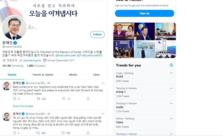 นาย มุนแจอิล ประธานาธิบดีสาธารณรัฐเกาหลีส่งคำอวยพรตรุษเต๊ตทั้งเป็นภาษาเกาหลี ภาษาเวียดนาม ภาษาจีนและภาษาอังกฤษ (https://twitter.com/moonriver3 |