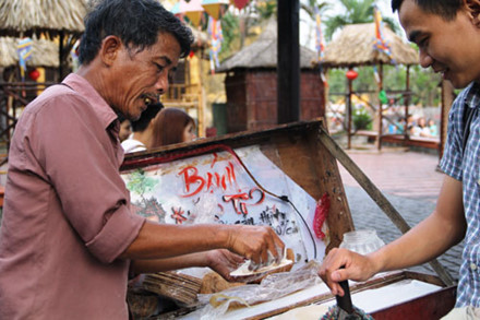 เมื่อเทียบกับเขตตัวเมืองต่างๆในเวียดนาม แม่ค้าหาบเร่ที่ขายของว่างในเมืองเก่าฮอยอันมีความหลากหลายและเป็นเอกลักษณ์เฉพาะ ซึ่งในรายการวันนี้ ขอแนะนำคุณเหงวียนเวียดจิ่งที่ขาย Kẹo tơ หรือ ลูกอมสายไหม ในย่านเก่าแก่ในเมืองเก่าออยอันมากว่า 26 ปี Kẹo tơ หรือ ลูกอมสายไหม ทำจาก วาฟเฟิล มอลโทสและมะพร้าวคือของว่างที่ได้รับการนิยมจากเด็ก