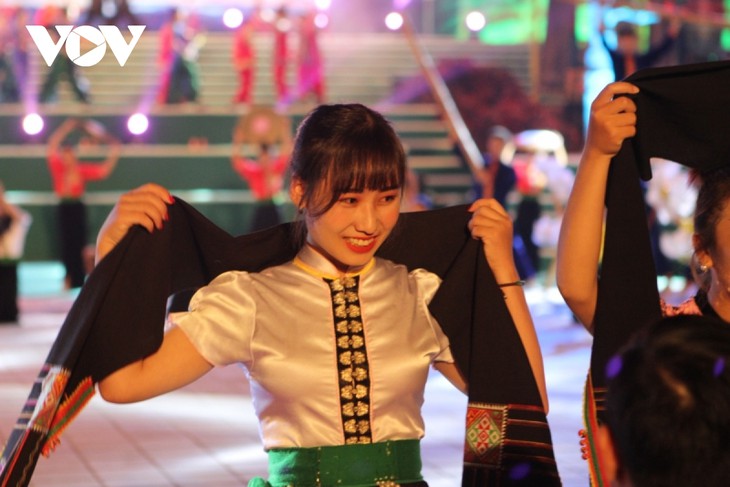 | การเต้นรำ "ผ้าพันคอ" (Tung Khăn) เป็นการเต้นรำที่กำเนิดพร้อมกับการพัฒนาของอาชีพทำทอผ้าฝ้าย แสดงให้เห็นถึงความสุขของผู้คนต่อผลงานในการทำงานของพวกเขา อีกทั้งแสดงให้เห็นถึงฝีมือของสาวชนเผ่าไทผ่านลวดลายอันละเอียดอ่อนที่ปักบนผ้าพันคอของตนเอง |