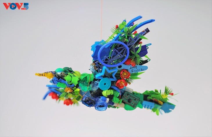 ศิลปิน ฟูจิ ฮิโรชิ กล่าวว่า “ผมนึกถึงภาพไดโนเสาร์ ซึ่งเป็นสัตว์ดึกดำบรรพ์ที่มีชีวิตเมื่อหลายล้านปี ดังนั้น ผมเลยเลือกไดโนเสาร์มาเป็นสัญลักษณ์สำหรับผลงานพลาสติกทุกชิ้นของผม ถึงแม้เด็กๆ ยังไม่มีความตระหนักรู้ถึงผลกระทบเชิงลบของพลาสติกที่มีต่อสิ่งแวดล้อมอย่างเพียงพอ แต่ผมหวังว่า จากงานนิทรรศการในครั้งนี้ เด็กๆ จะมีความเข้าใจมากขึ้นเกี่ยวกับปัญหาดังกล่าว (ภาพถ่ายโดย Hong Hai/Vietnam+)