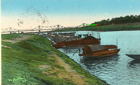 บรรยากาศการขนถ่ายสินค้าริมแม่น้ำ โดยมีแบคกราวคือสะพานเหล็กลองเบียน