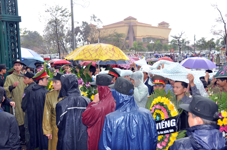 ที่จังหวัดกว๋างบิ่ง ซึ่งเป็นบ้านเกิดของพลเอกหวอเงียนย๊าป ถึงแม้ฝนได้ตกลงมาอย่างหนักแต่ประชาชนจำนวนมากยังคงได้เดินทางไปร่วมพิธีไว้อาลัยพลเอกหวอเงียนย๊าป