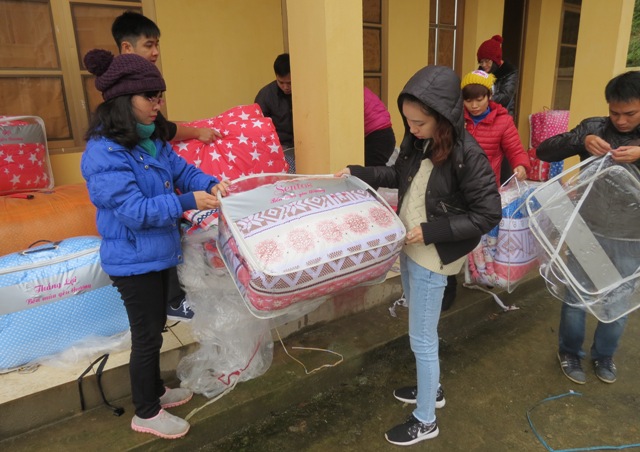 สิ่งของจำเป็นรวมมูลค่า 90 ล้านด่ง ซึ่งประกอบด้วย ผ้าห่มกันหนาว ผ้าพันคอพรม เสื้อกันหนาว อุปกรณ์การเรียน...