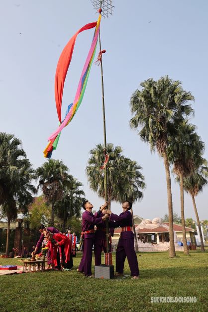 ส่วนนาย บุ่ยวันเถาะ เจ้าหน้าที่ศูนย์วัฒนธรรมภาพยนตร์จังหวัดแทงฮว๊า เผยว่า ในพิธีตั้งเสาตุง หนุ่มสาวจะร่วมกันรดน้ำต้นเสาตุงและเชิญ “บ่ามั้ย” หรือผู้หญิงที่ได้รับการนับถือในหมู่บ้านมาจัดพิธีตั้งเสาตุง