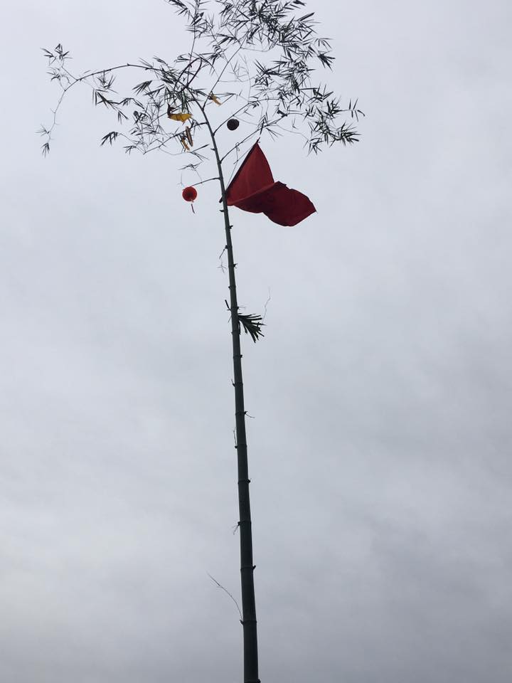 ในบริเวณบ้านเวียดที่ตั้งอยู่ในพิพิธภัณฑ์ชาติพันธุ์เวียดนาม ผู้เข้าร่วมงาน๒๐-๓๐คนกำลังยืนเป็นรูปครึ่งวงกลมแล้วมองไปที่ลานกว้างด้านหน้า ซึ่งเป็นจุดที่ตั้งเสาตุง คุณ เหงวียนซวนด่วาน นักวิจัยเกี่ยวกับวัฒนธรรมเวียดนามในชุดเสื้อยาวสีดำกำลังเตรียมพิธีเซ่นไหว้เจ้าที่เจ้าทาง ซึ่งสิ่งของเซ่นไหว้ประกอบด้วย ขนมข้าวต้นมัดใหญ่ ข้าวเหนียว๑จานและหมูยอ๑จานที่ถูกวางไว้บนโต๊ะปูด้วยผ้าสีขาว นี่เป็นพิธีกรรมที่สำคัญของชาวเวียดนามในช่วงตรุษเต๊ต เพื่อเตรียมให้แก่พิธีการตั้งเสาตุง อันดับแรกคือต้องเลือกต้นใผ่ โดยผู้ที่รับผิดชอบตัดต้นไผ่ต้องเป็นผู้ที่มีครอบครัวที่สมบูรณ์และมีความสุขตามความเชื่อของคนเวียดนามคือมีทั้งลูกชายและลูกสาวและถ้าหากเป็นปีคี่ บ้องไม้ไผ่ก็ต้องมีจำนวนเป็นเลขคี่ นาย เหงวียนซวนดว่านเล่าถึงความหมายของการตั้งเสาตุงและการแขวนสิ่งของที่มีความหมายบนเสาตุ้งว่า “บนเสาตุงจะมีการแขวนใบสับปะรดและระฆังที่ทำจากดินเพื่อไล่ผี ขนมข้าวต้มมัดใหญ่๒อัน คำกลอนคู่ตรุษเต๊ต ซึ่งเป็นสิ่งของที่จำเป็นสำหรับช่วงตรุษเต๊ต มีธัญพืช๕ชนิดในตะกร้าเพื่อสื่อถึงความผูกพันธ์กับอาชีพเกษตรกรรม ”