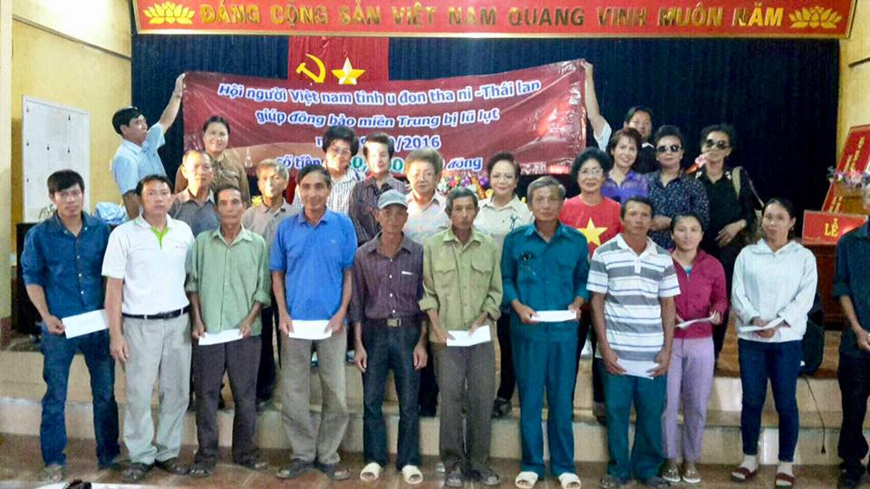 (VOVworld) - หลังจากได้ทราบข่าวเกี่ยวกับอุทกภัยในภาคกลางเวียดนาม ชมรมชาวเวียดนามในประเทศไทยได้รณรงค์เปิดรับบริจาคเงินช่วยเหลือผู้ประสบอุทกภัย บนเจตนารมณ์แห่งการช่วยเหลือจุนเจือกัน ตามข้อมูลของสถานทูตเวียดนามประจำประเทศไทย จนถึงวันที่ 1 พฤศจิกายนปี 2016 ชาวเวียดนามในประเทศไทยได้บริจาคเงินเกือบ 3.9 พันล้านด่ง รวมทั้งเงินช่วยเหลือของสมาคมชาวเวียดนามที่อาศัยในประเทศไทยสาขาต่างๆ เช่นสมาคมชาวเวียดนามในกรุงเทพฯ สมาคมชาวเวียดนามในจังหวัดเชียงใหม่ สมาคมชาวเวียดนามในจังหวัดชัยภูมิ สมาคมมิตรภาพไทย เวียดนามและสมาคมนักธรุกิจไทย เวียดนาม เป็นต้น โดยเฉพาะเมื่อวันที่ 31 ตุลาคมที่ผ่านมา สมาคมชาวเวียดนามในจังหวัดอุบลราชธานีได้รับสิ่งของช่วยเหลือจากนายสมศักดิ์ จังตระกุล. ผู้ว่าราชการจังหวัดอุบลราชธานี คือเสื้อผ้า 400 ชุดเพื่อให้การช่วยเหลือผู้ประสบอุทกภัยในภาคกลางเวียดนาม ซึ่งน้ำใจของชาวเวียดนามในประเทศไทยเป็นสิ่งที่ไม่สามารถประเมินค่าได้ ดังความเห็นของนาง เหงียน ถิ ซวน แอง ครูชาวเวียดนามในจังหวัดอุดรธานี ที่แต่งเป็นบทกวีเมื่อวันที่ 23 ตุลาคม โดยมีความหมายว่า
