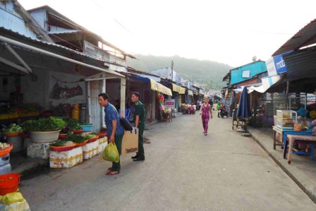 ตลาดช่วงนี้มีสินค้าครบทุกอย่างไว้คอยบริการ ระยะทางจากสะพานเรือถึงศาลเจ้าหว่างราว ๓๐๐ เมตรมีจุดขายสินค้าจำเป็นที่ดูเหมืนมินิมาร์ท ร้านขายของชำก็มีสินค้าจำพวกขนม ทอฟฟี่ เบียร์และเหล้าไว้บริการลูกค้า ส่วนร้านขายผัก ผลไม้และดอกไม้มีลูกค้ามาอุดหนุนอย่างอุ่นหนาฝาคั่ง คุณป้าเถี่ยวหงอกญูงที่อาศัยบนเกาะมา ๒๑ ปีและได้เห็นการเปลี่ยนแปลงของตำบลเกาะในเทศกาลตรุษเต็ตแต่ละปี คุณป้าญูงกล่าวว่า “ สินค้าทุกอย่างได้รับการขนส่งมาที่นี่เพื่อขายให้แก่ชาวบ้านและทหาร ปีนี้สินค้ามากกว่าปีก่อน ส่วนสิ่งของที่จำเป็นจะมาถึงในวันที่ ๒๗ และ ๒๘ เดือน ๑๒ ป้าซื้อขนมขบเคี้ยว ผลไม้และอาหารต่างๆ ”