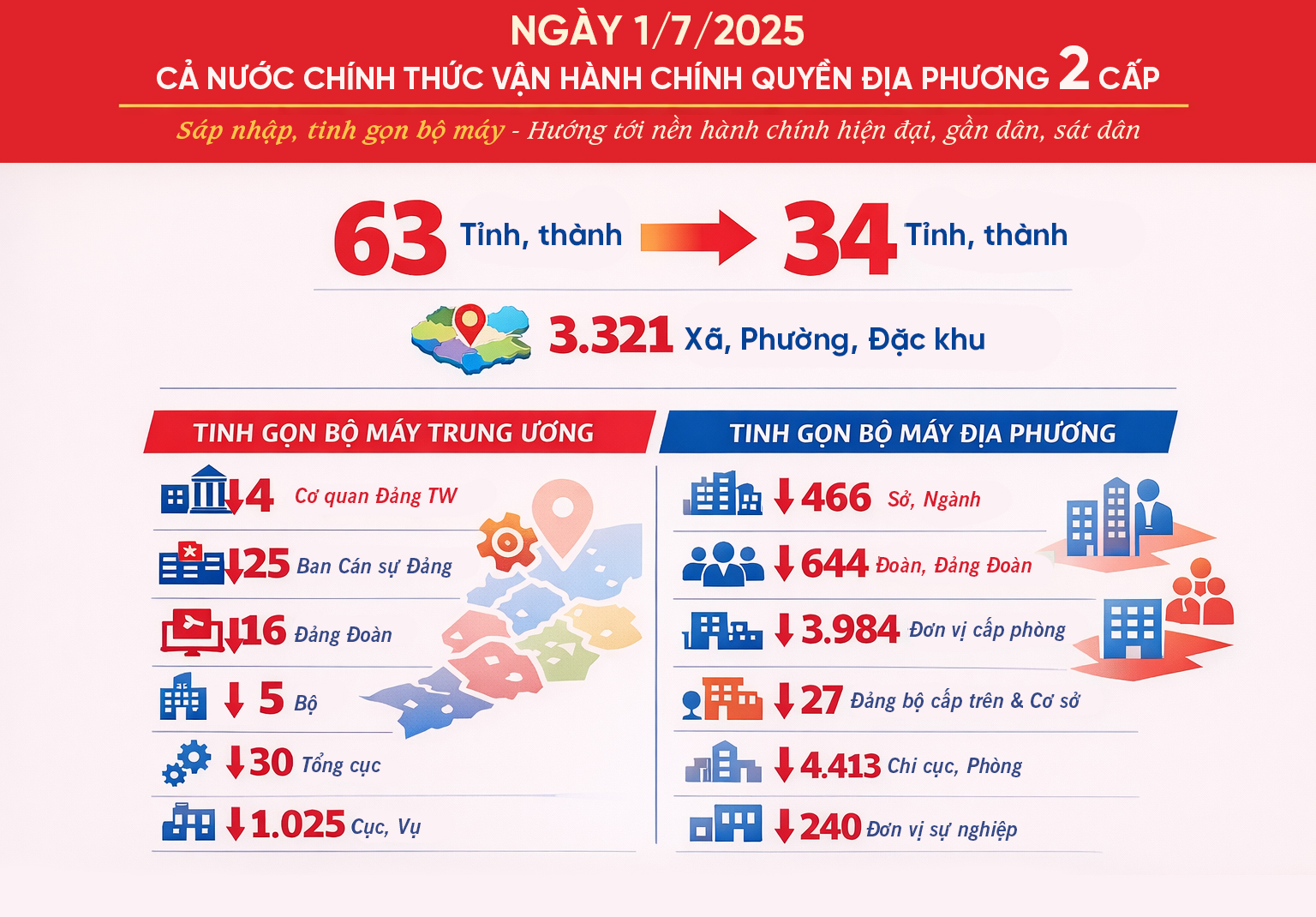 เมื่อวันที่ 1 กรกฎาคมปี 2025 ทั่วประเทศได้เริ่มปฏิบัติรูปแบบทางการปกครองท้องถิ่น 2 ระดับอย่างเป็นทางการ หลังจากควบรวมจังหวัดและนคร 63 แห่งลงเหลือ 34 แห่ง ด้วยตำบล แขวงและเขตพิเศษ 3,321 แห่ง เลขาธิการใหญ่พรรค โตเลิม ย้ำว่า การตัดสินใจ “ปรับปรุงโครงสร้างองค์กรและพื้นที่ราชการของประเทศ” เป็นก้าวเดินทางประวัติศาสตร์ที่มีความหมายสำคัญเชิงยุทธศาสตร์ เป็นการบ่งบอกถึงระยะใหม่ของการพัฒนาในกระบวนการปรับปรุงกลไก การบริหารราชการ ปรับปรุงสถาบันและองค์กรของระบบการเมืองให้กระทัดรัด พร้อมเพรียงและมีประสิทธิภาพ โดยมุ่งสู่การบริหารราชการที่ทันสมัย มีความสัมพันธ์ที่ใกล้ชิดกับประชาชน รับใช้ประชาชน เพื่อผลประโยชน์ของประชาชน