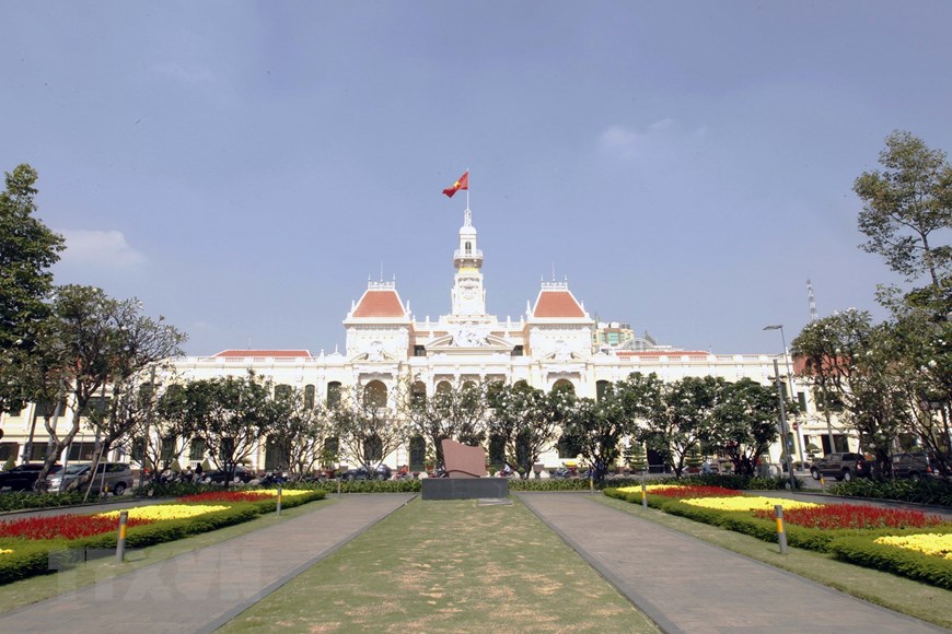 ด้านหน้าสำนักงานของคณะกรรมการประชาชนนครโฮจิมินห์ได้รับการตกแต่งอย่างสวยงาม (Photo: TTXVN) |