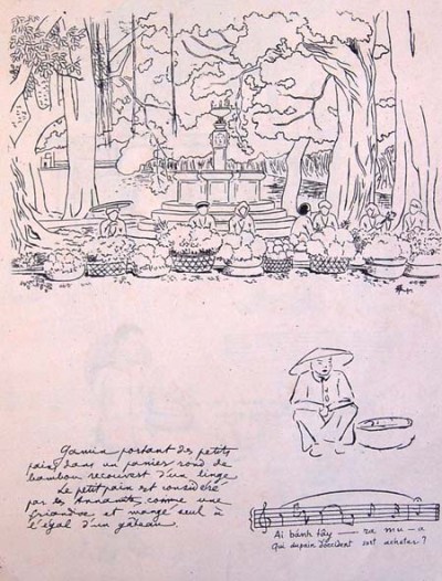 Street calls were beloved in the 1950s, when they evolved into “luc bat” poems, a verse form that begins with a six-syllable line and ends with an eight-syllable line. Street vendors were featured in paintings by To Ngoc Van, Tran Phenh, and other renowned painters of the first generation of the Indochina Fine Arts College. These artists produced pictures of vendors selling strawberries, rice cakes, ice cream, tofu, pottery, and spring rolls with descriptive captions and their calls transcribed on a music staff. Tien said he recognized some of the calls when he played them on a musical instrument.