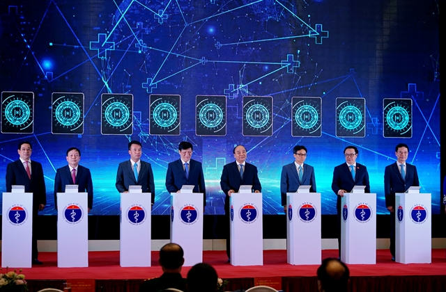 Prime Minister Nguyen Xuan Phuc (C) and senior officials launch a remote healthcare consultation and support (telehealth) network that connected medical examination and treatment facilities with hospitals of Hanoi and HCM City (Photo:VNS/Thanh Hai) |