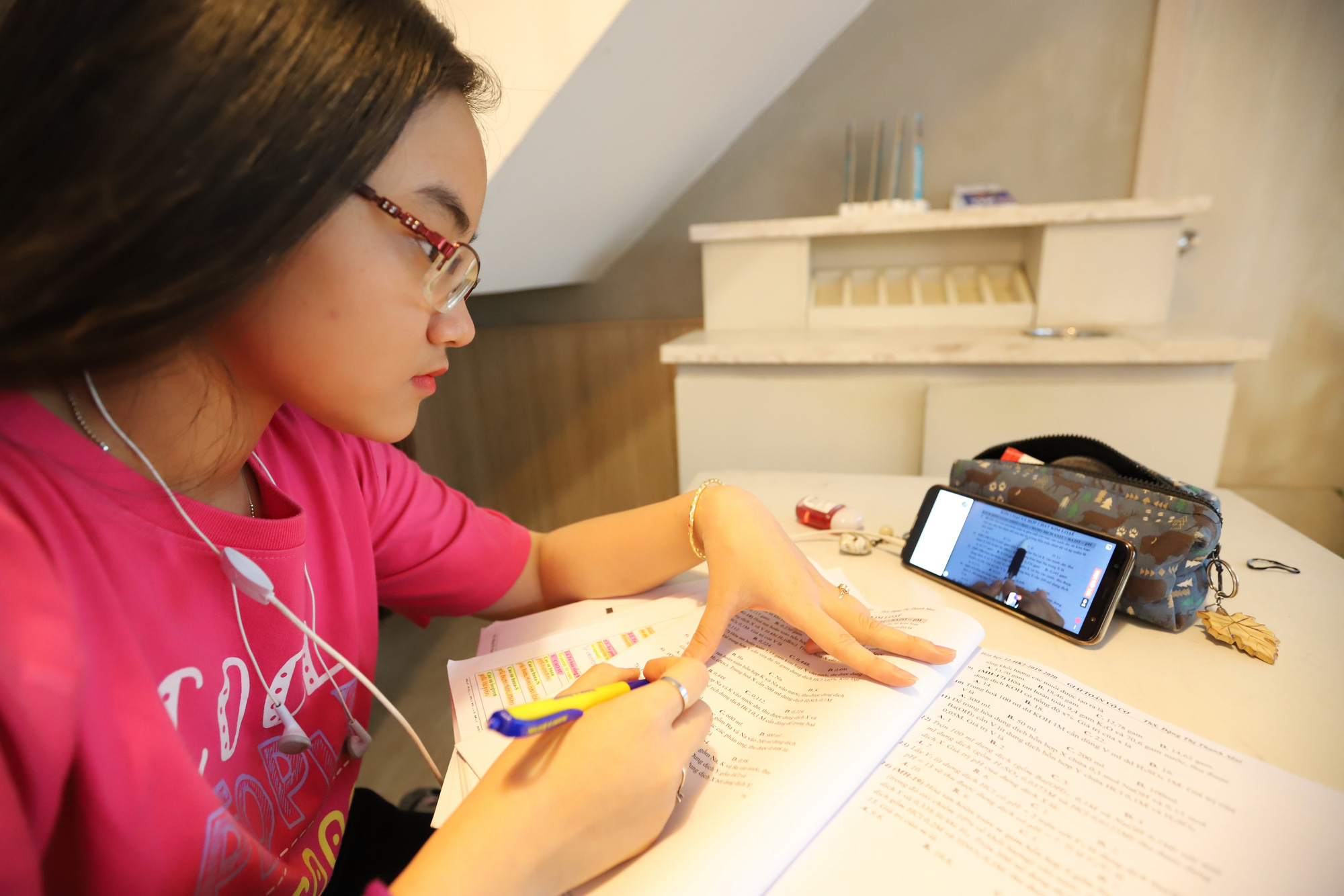 A student reviews lessons on her phone during a school break amid the COVID-19 epidemic in Ho Chi Minh City, February, 2020. (Photo: Nhu Hung / Tuoi Tre) |