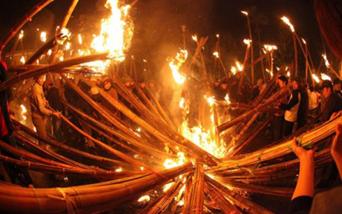 | People in Nam Dinh province use their wooden sticks to take fire from the communal house. (Photo: VOV) |