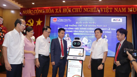 (VOV5) - Với thiết kế hiện đại, thân thiện, robot có khả năng nhận diện và chào hỏi tự động, đồng thời hướng dẫn người dân đến đúng quầy, phòng ban cần giải quyết thủ tục.