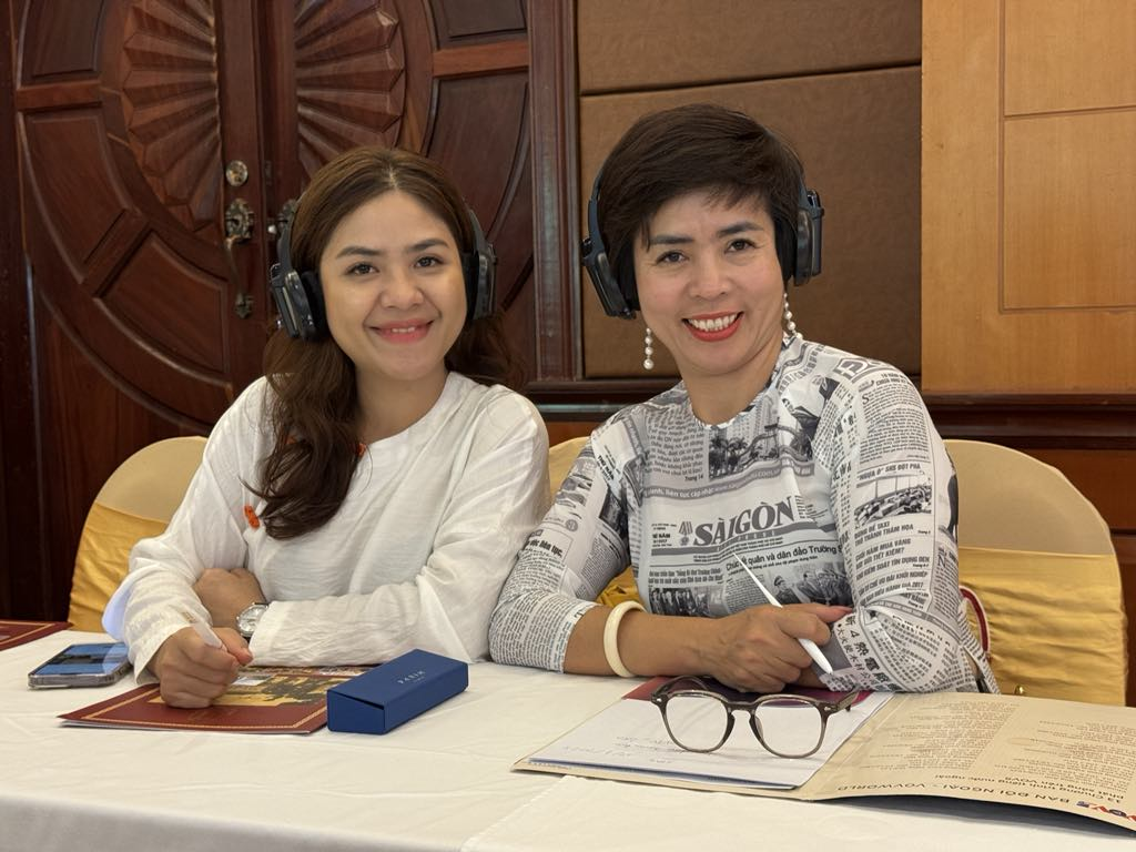 Nu Nu (bìa trái), một thính giả người Lào rất yêu thích chương trình tiếng Lào của VOV5, chụp ảnh cùng chị Chu Mỹ Bình, Trưởng phòng ASEAN 1 - VOV5