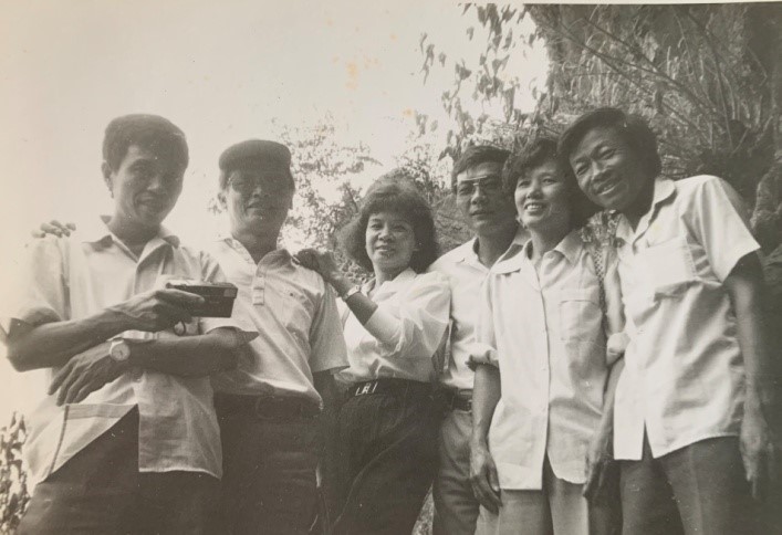 Cùng đồng nghiệp trong một chuyến công tác ở Hà Bắc (Nay là Bắc Giang) và Lạng Sơn. Từ phải sang: nhà báo Huy Dung, Thụy Chóng cán bộ cơ sở, Huyền Yến và hai cán bộ địa phương |