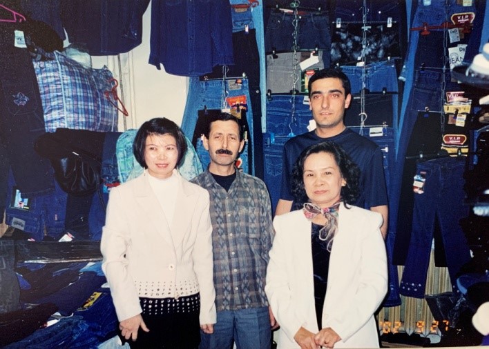 Một gian hàng của người Việt ở Saliut 5 (Tổng Công Ty Thương mại Bến Thành-Matxcova). Người mặc áo trắng đầu tiên bên trái là chủ và 2 người đàn ông Nga đứng sau làm thuê cho chị. |