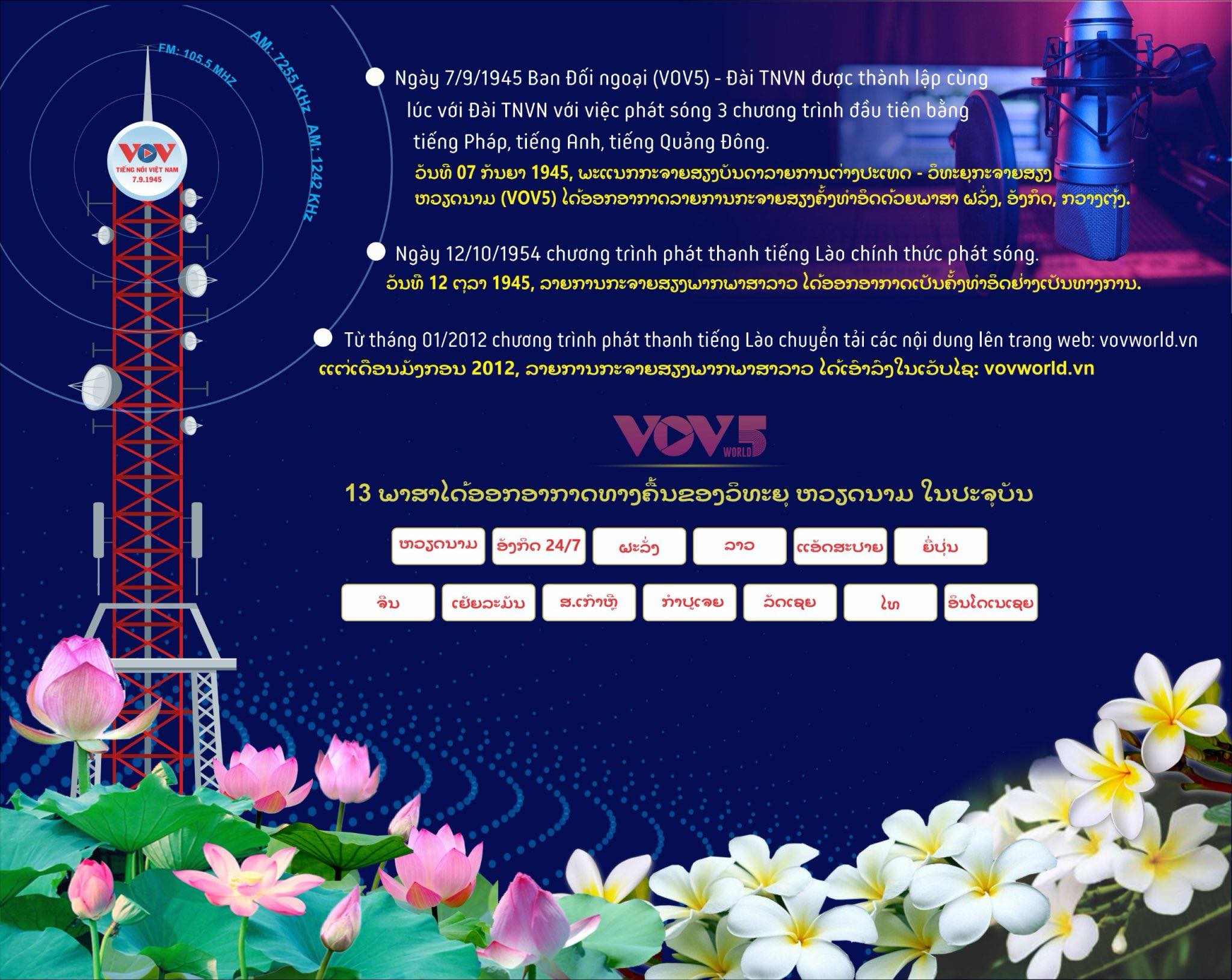 Ngày 12/10/1954 chương trình phát thanh tiếng Lào chính thức phát sóngTừ tháng 1/2022, chương trình truyền tải các nội dung lên trang web vovworld.vn |