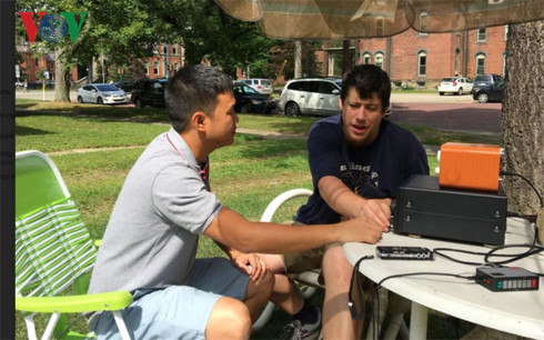 | Paul hướng dẫn về các thiết bị nghe đài của mình với phóng viên VOV. |