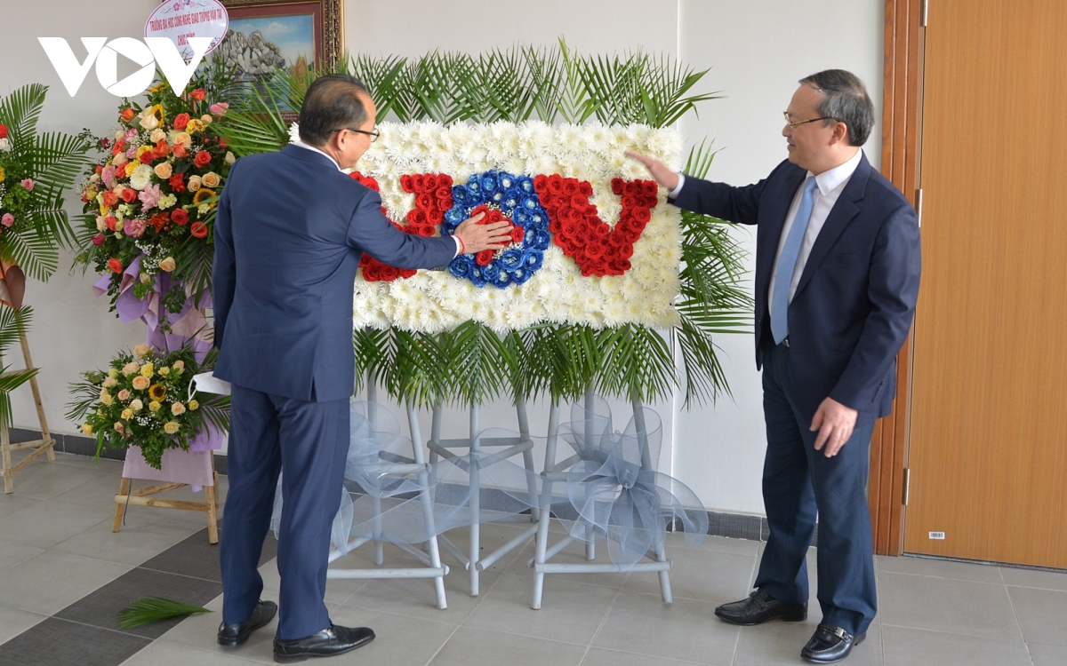 Tổng Giám đốc VOV Đỗ Tiến Sỹ (bìa phải) giới thiệu với Đại sứ Campuchia Chay Navuth về logo VOV làm từ hoa - Ảnh: Trung Hiếu/ VOV |