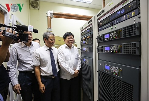 | Lãnh đạo Đài TNVN và lãnh đạo tỉnh TT Huế tại phòng máy phát sóng. |