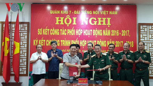 Thời gian qua, hai đơn vị đã cùng phối hợp triển khai tổ chức nhiều hoạt động thiết thực, phù hợp với nhiệm vụ chính trị và thế mạnh của mỗi bên. Nhiều tin bài tuyên truyền trên sóng của Đài Tiếng nói Việt Nam về kết quả thực hiện nhiệm vụ quân sự, quốc phòng của lực lượng vũ trang Quân khu 7 và nhân dân trên địa bàn được thực hiện liên tục, thường xuyên với nhiều loại hình báo chí.
