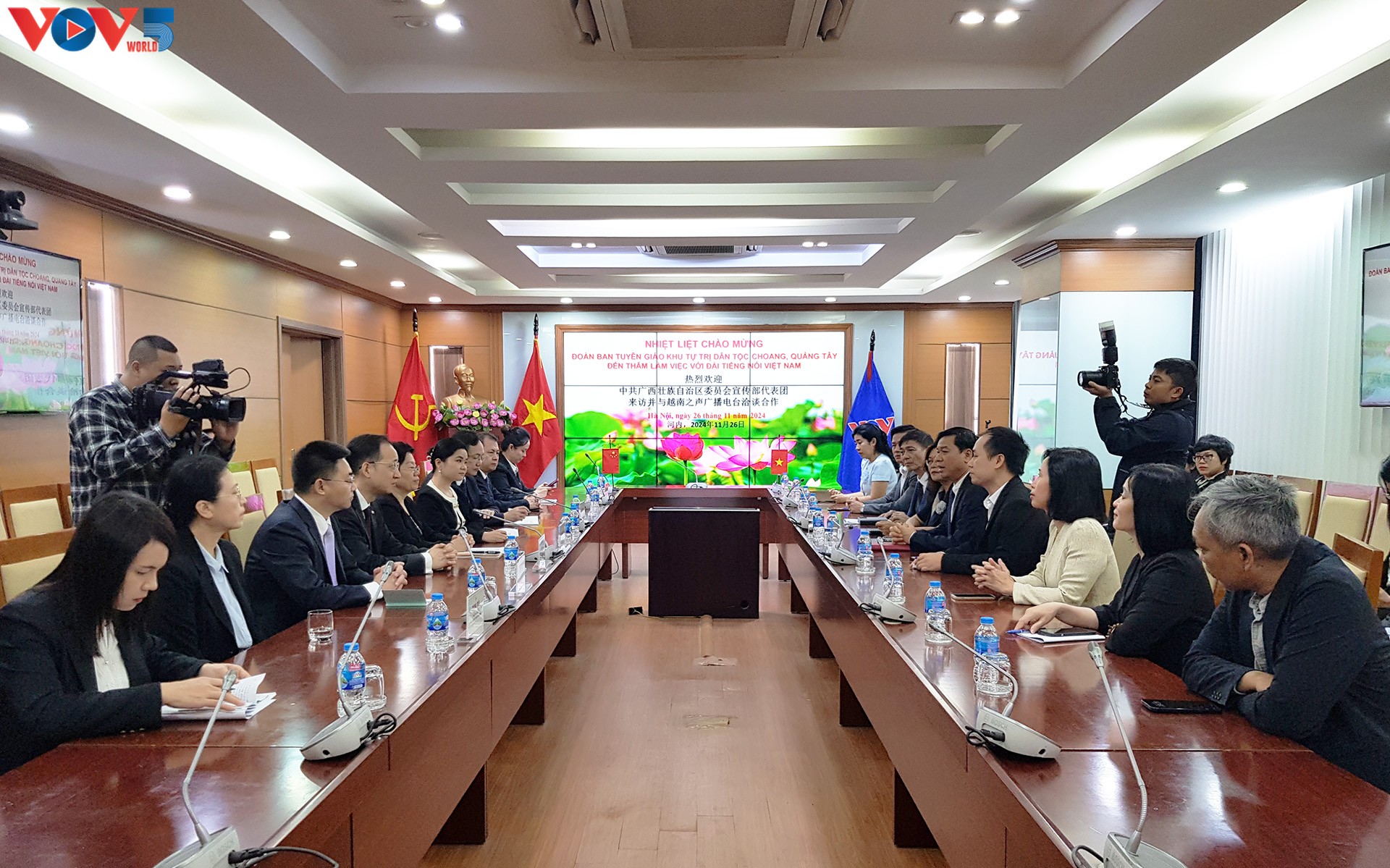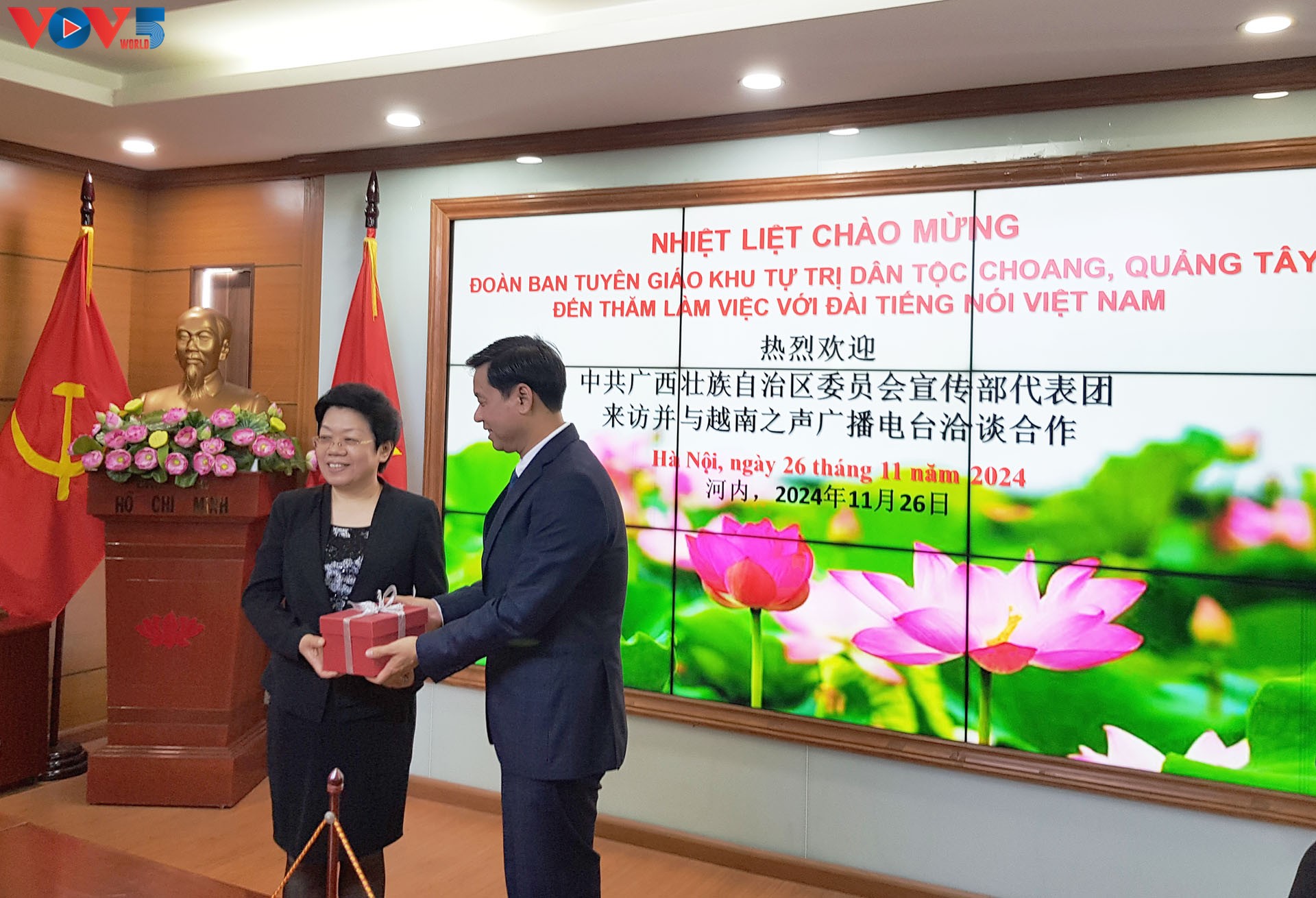 Sáng 26/11, tại Trung tâm phát thanh Quốc gia, số 58 Quán Sứ, Hà Nội, đoàn đại biểu Ban Tuyên truyền Đảng ủy Khu tự trị dân tộc Choang, Quảng Tây (Trung Quốc) đến thăm và làm việc với Đài Tiếng nói Việt Nam và tham dự buổi lễ đóng máy bộ phim tài liệu “Con đường phát triển”. Thừa ủy quyền của Tổng Giám đốc Đài Tiếng nói Việt Nam, Phó Tổng giám đốc Đài Tiếng nói Việt Nam Ngô Minh Hiển tiếp và làm việc với bà Trần Dịch Quân, Ủy viên thường vụ Đảng ủy, Trưởng Ban Tuyên truyền Đảng ủy Khu tự trị dân tộc Choang, Quảng Tây, làm trưởng đoàn.