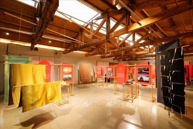 Không gian triển lãm sản phẩm vải truyền thống ASEAN. Ảnh: Khánh Vân/ TTXVN |