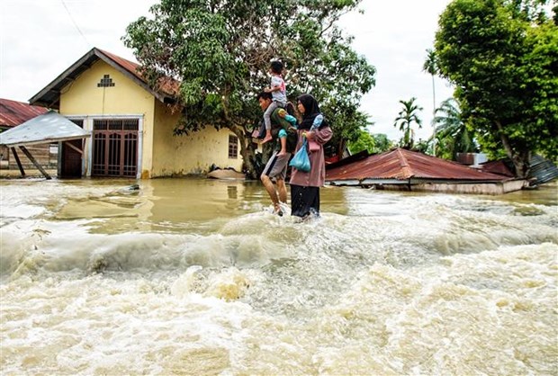 Người dân di chuyển qua vùng ngập lụt tại Lhokseumawe, Aceh, Indonesia, ngày 10/10 - Ảnh: AFP/TTXVN |