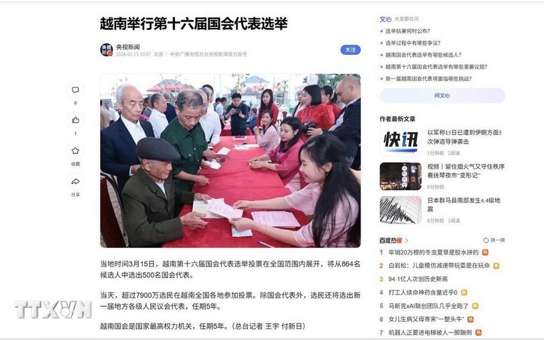 Ảnh chụp màn hình một bài báo của Trung Quốc về bầu cử tại Việt Nam. Ảnh: TTXVN |