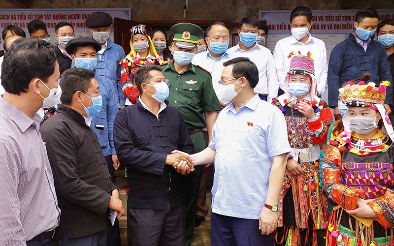 Trong chuyến giám sát, kiểm tra công tác bầu cử, Chủ tịch Quốc hội Vương Đình Huệ đã tiếp xúc với cử tri Khu vực bỏ phiếu số 4 tại xã Lũng Cú, huyện Đồng Văn, tỉnh Hà Giang - Ảnh: Doãn Tấn (TTXVN)