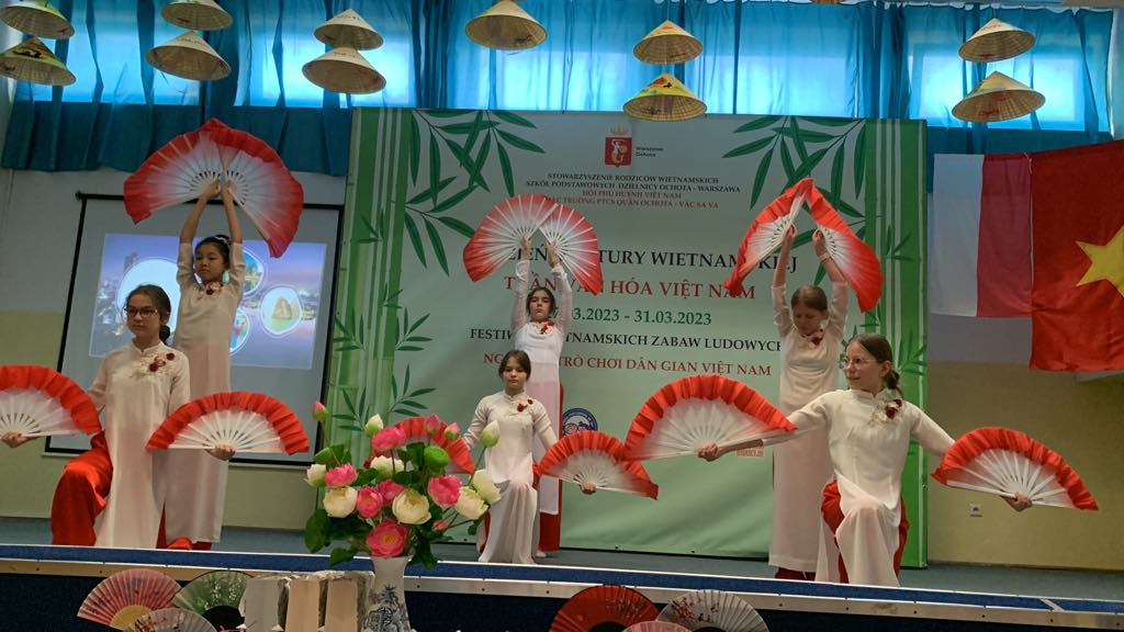 Các học sinh trường PTCS số 175, thành phố Warszawa, biểu diễn văn nghệ nhân Tuần văn hóa Việt Nam 2023 với chủ đề "Ngày hội trò chơi dân gian Việt Nam". |