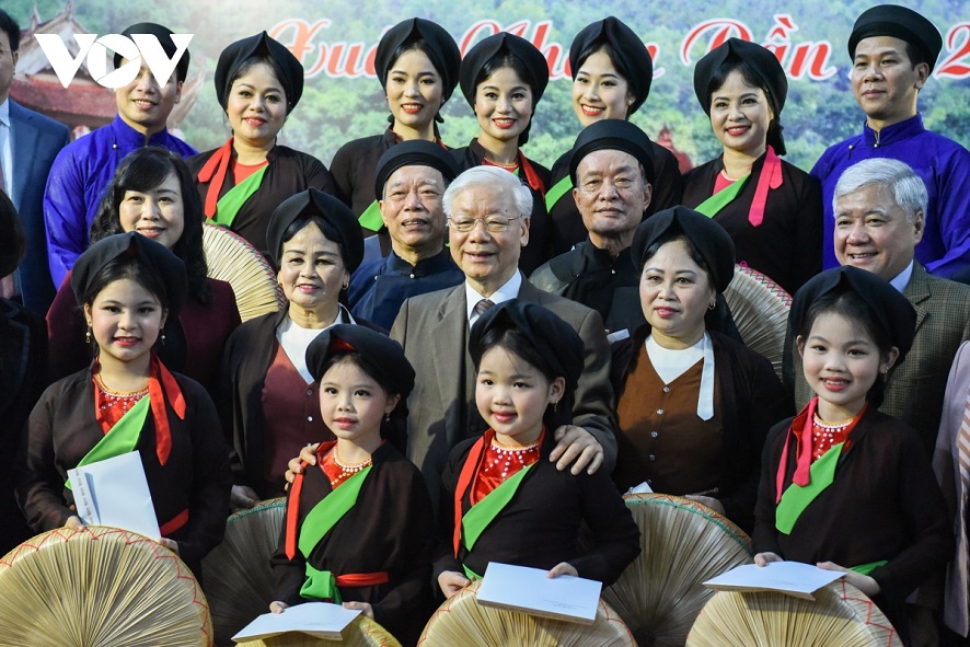Nhân dịp này, Tổng Bí thư Nguyễn Phú Trọng tới dâng hương tại Di tích quốc gia đặc biệt Đền Đô, nơi thờ 8 vị vua triều Lý; gặp mặt các nghệ nhân biểu diễn Quan họ Bắc Ninh.