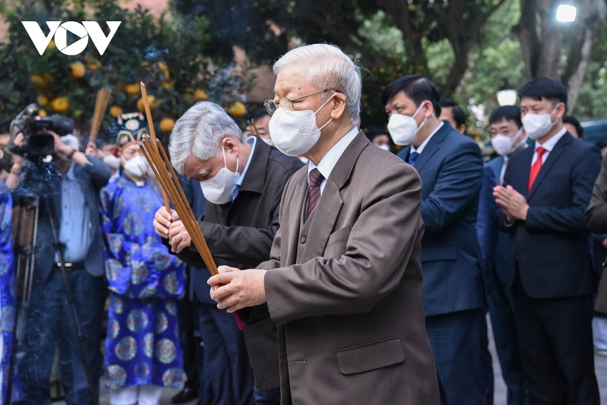 Tổng Bí thư Nguyễn Phú Trọng dâng huơng tưởng niệm 8 vị vua nhà Lý tại Di tích lịch sử - văn hóa Đền Đô (phường Đình Bảng, thành phố Từ Sơn). Ảnh: VOV |