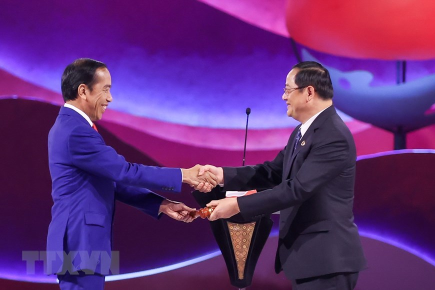 ổng thống Indonesia Joko Widodo (trái) trao búa Chủ tịch luân phiên ASEAN 44 cho Thủ tướng Lào Sonexay Siphandone. Ảnh: Dương Giang/TTXVN |