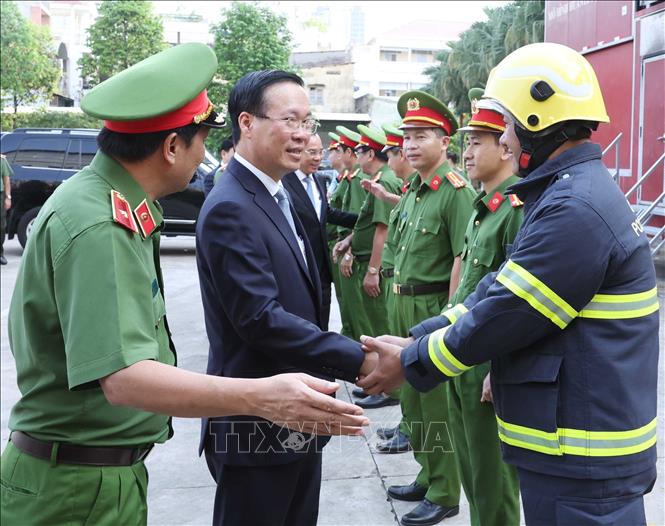 Chủ tịch nước Võ Văn Thưởng thăm hỏi, động viên, chúc Tết cán bộ, chiến sĩ Phòng Cảnh sát phòng cháy chữa cháy và cứu nạn, cứu hộ Công an Thành phố HCM. Ảnh: TTXVN |