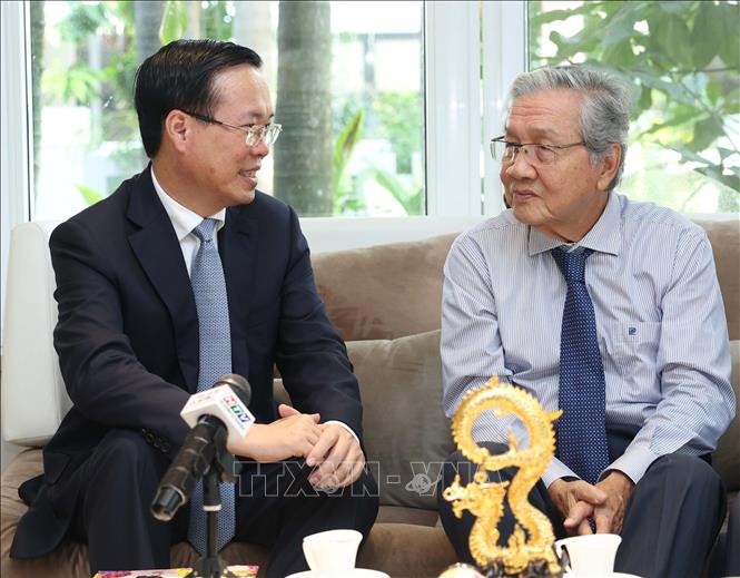 Chủ tịch nước Võ Văn Thưởng thăm Giáo sư, bác sĩ Nguyễn Chấn Hùng tại khu đô thị Phú Mỹ Hưng, phường Tân Phú, Quận 7. Ảnh: TTXVN |