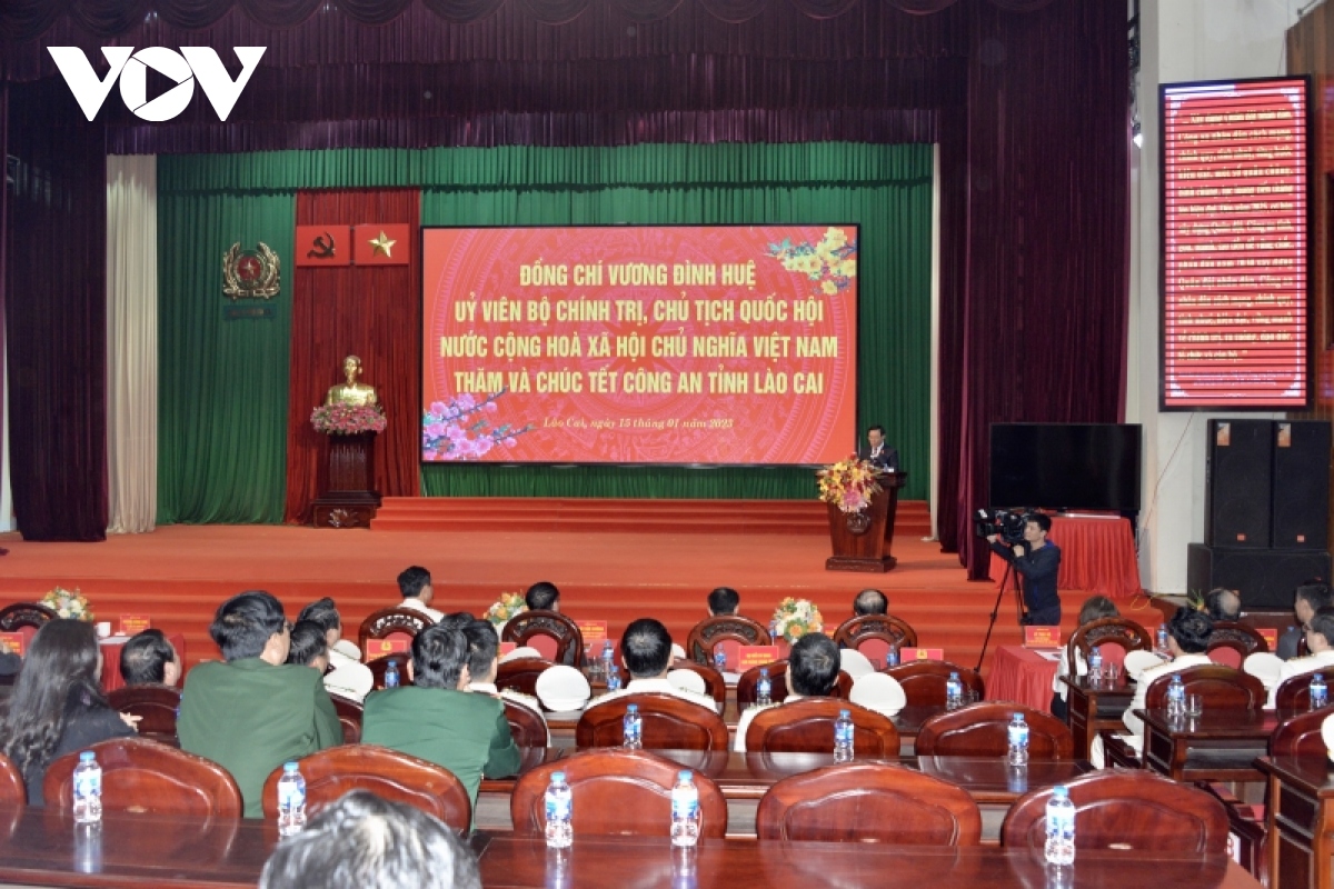 Chủ tịch Quốc hội Vương Đình Huệ thăm, chúc Tết Công an tỉnh Lào Cai. Ảnh: Lê Tuyết/VOV |