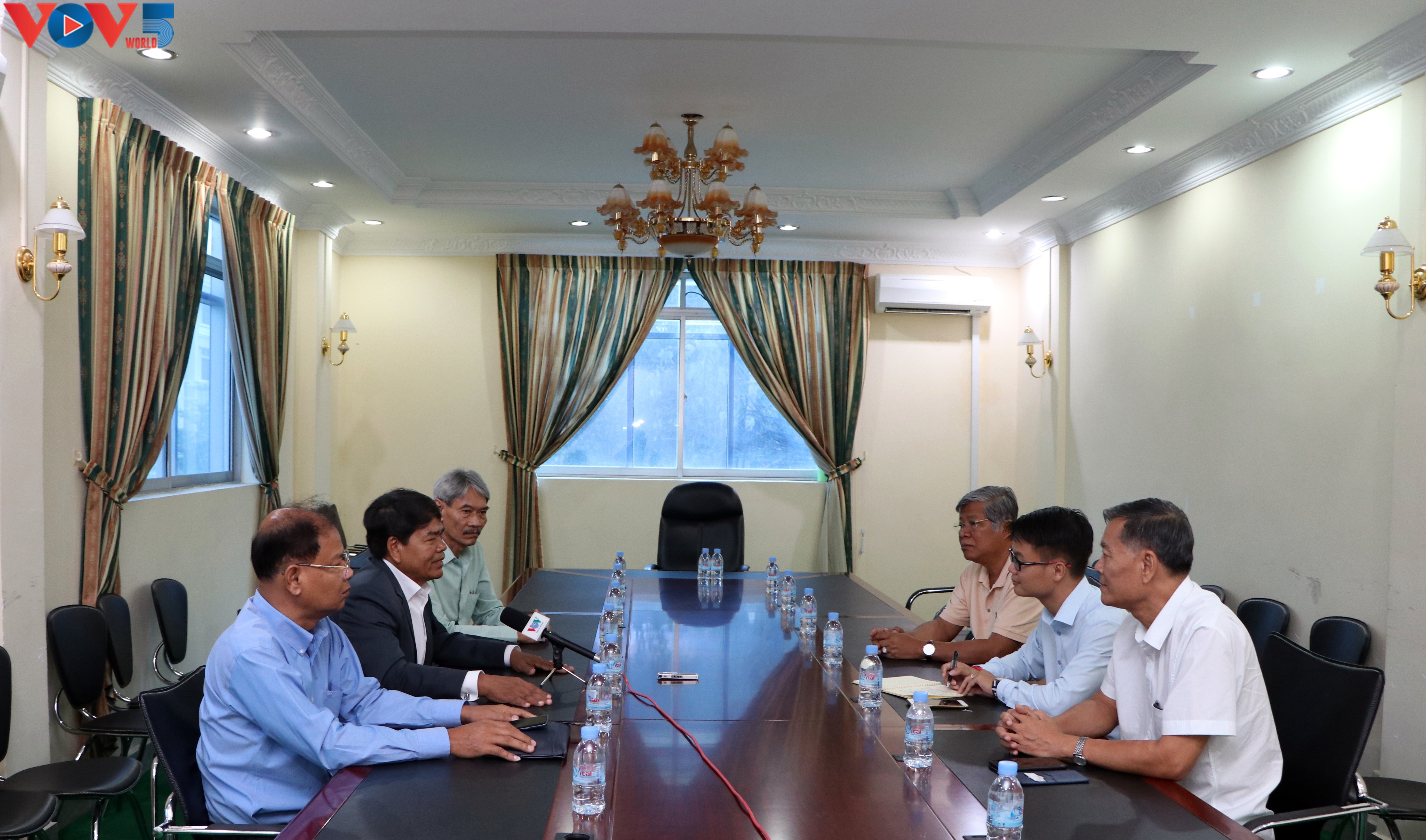 Mặc dù đến trước lịch hẹn hơn 10 phút nhưng chúng tôi có chút bất ngờ khi Quốc vụ khanh, nguyên Tổng giám đốc Tuôn Sa-rát (Tuol Sarath) và các cán bộ Đài Phát thanh Quốc gia Campuchia đã chờ sẵn ngay tại sảnh trụ sở. Thoáng chút bối rối, xa cách ngay lập tức tan biến khi anh em vồn vã chào đón, tay bắt mặt mừng hỏi thăm sức khỏe nhau như những người bạn thân thiết lâu ngày mới gặp lại. Cảm xúc của chúng tôi bị “tan chảy” ngay ở những giây phút đầu tiên khi quan sát thấy xung quanh là vô số những hình ảnh, đồ vật liên quan đến VOV được các bạn gìn giữ, ghi chú thích và trưng bày ở những vị trí trang trọng. Thấy chúng tôi chăm chú ngắm nhìn, anh Tuol Sarath giải thích đôi chút về lịch sử các bức ảnh đã phai màu, rồi giục đi lên phòng làm việc để nghe anh em kể về nhiều câu chuyện thú vị khác.