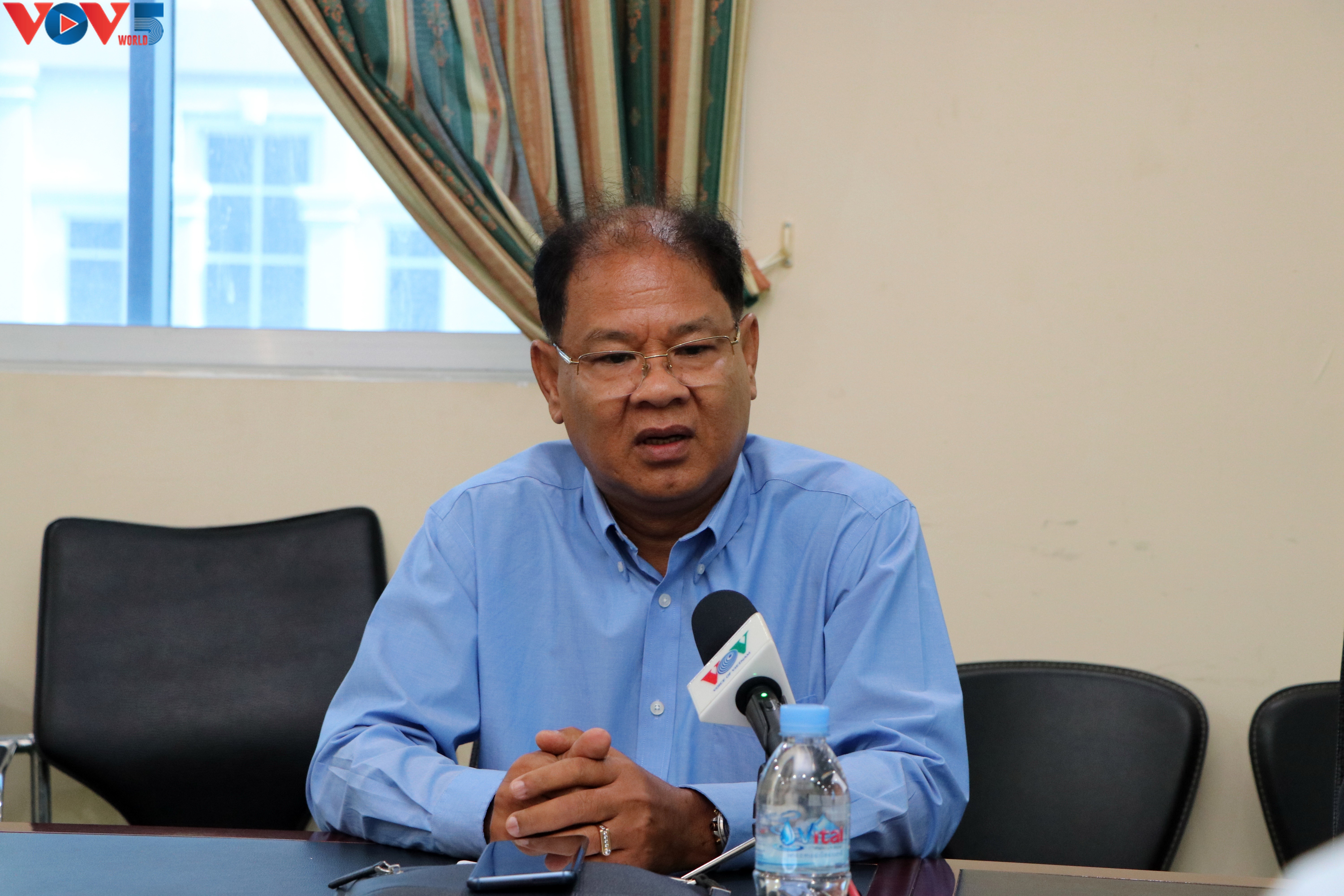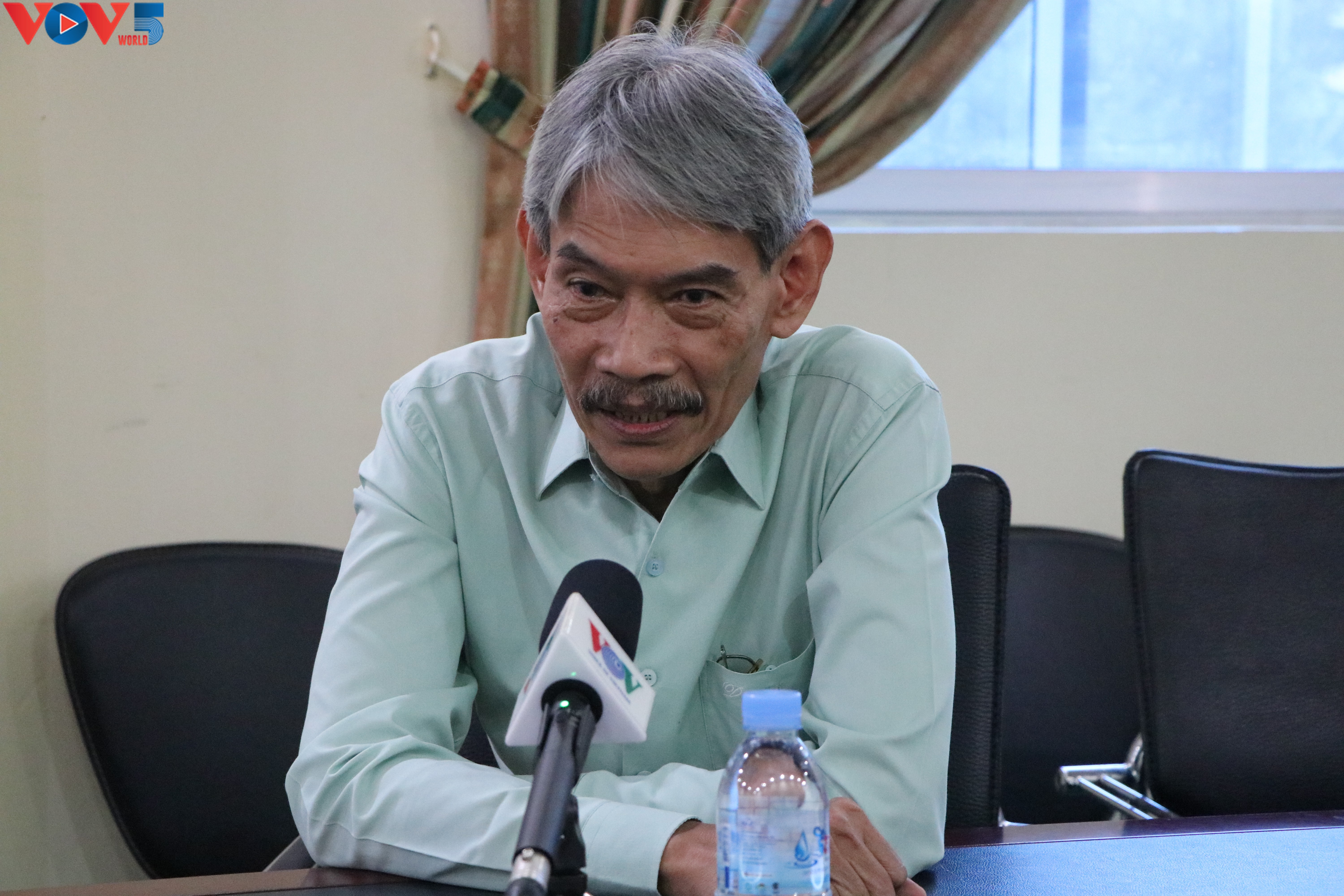 Phát thanh viên Bou Van Narith (phải) hào hứng kể về những kỷ niệm với phóng viên Văn Đỗ.