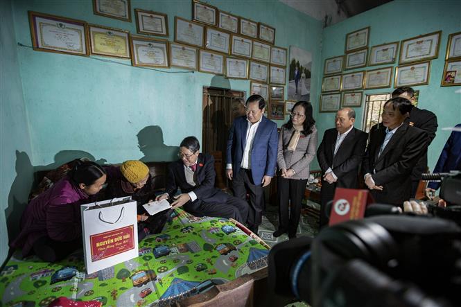 Phó Chủ tịch Quốc hội Nguyễn Đức Hải cũng các lãnh đạo tỉnh Hòa Bình thăm hỏi tặng quà hộ gia đình chính sách, hộ gia đình có hoàn cảnh đặc biệt khó khăn trên địa bàn huyện Đà Bắc. Ảnh: Trọng Đạt/TTXVN |