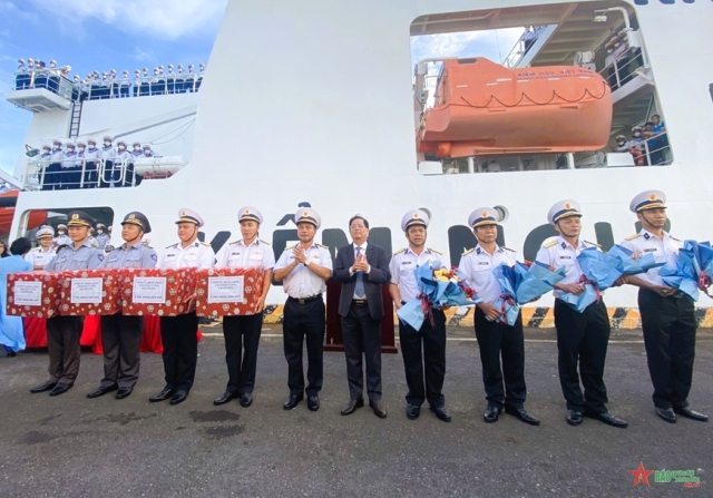 Lãnh đạo tỉnh Khánh Hòa và Vùng 4 Hải quân tặng quà cán bộ, chiến sĩ trước khi lên tàu. Ảnh:qdnd.vn |