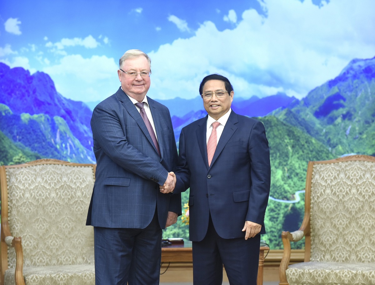 Thủ tướng Phạm Minh Chính tiếp Chủ tịch Hội Luật gia Liên bang Nga, Sergey Stepashin, nguyên Thủ tướng Chính phủ Liên bang Nga - Ảnh: VGP/Nhật Bắc