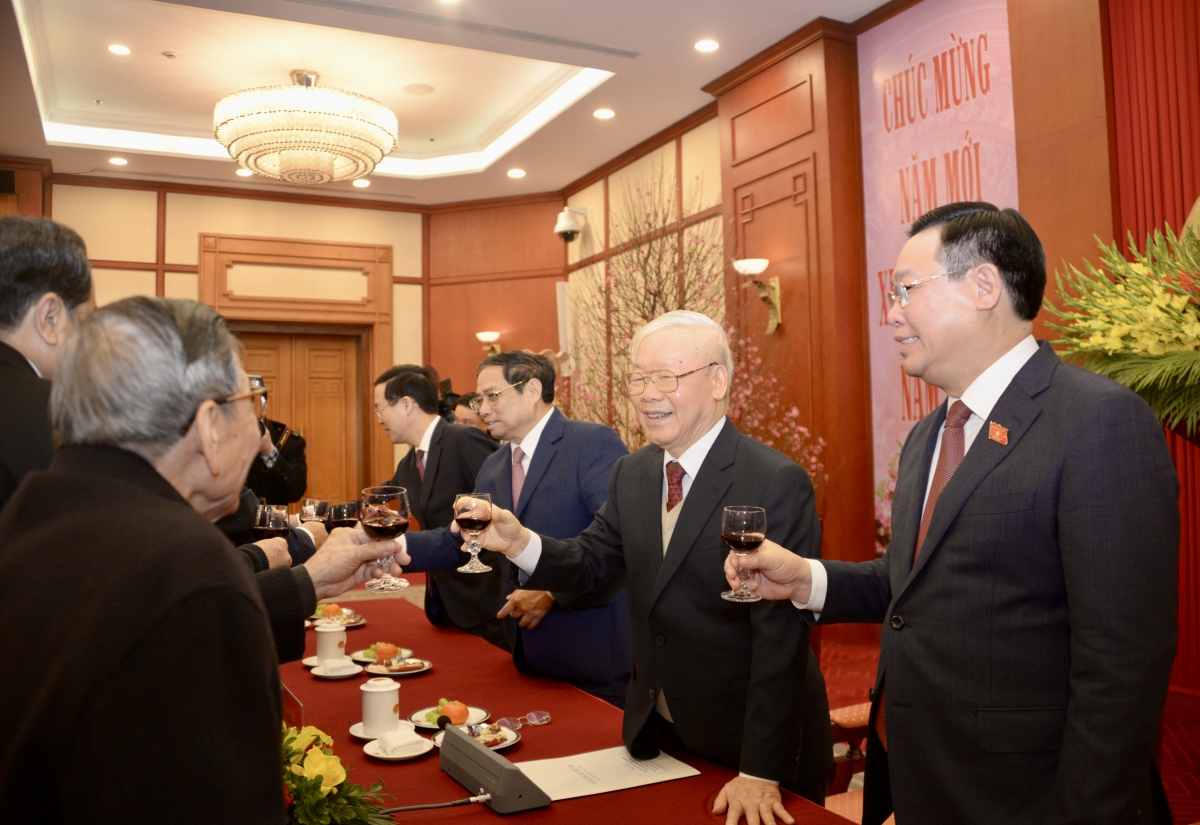 Nhân dịp chuẩn bị đón Tết Nguyên đán Quý Mão 2023, sáng nay (19/1), tại Hà Nội, Tổng Bí thư Nguyễn Phú Trọng chủ trì buổi gặp mặt, chúc Tết các lãnh đạo, nguyên lãnh đạo Đảng, Nhà nước, Mặt trận Tổ quốc Việt Nam và đồng bào, chiến sĩ cả nước, kiều bào ở nước ngoài. Tham dự có nguyên Tổng Bí thư Nông Đức Mạnh; nguyên Chủ tịch nước Nguyễn Xuân Phúc; Thủ tướng Chính phủ Phạm Minh Chính; Chủ tịch Quốc hội Vương Đình Huệ; nguyên Chủ tịch Quốc hội Nguyễn Sinh Hùng và Nguyễn Thị Kim Ngân; quyền Chủ tịch nước Võ Thị Ánh Xuân… đại diện lãnh đạo các cơ quan, đoàn thể Trung ương và thành phố Hà Nội.