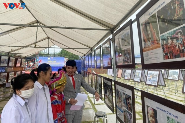 Giới thiệu cho học sinh dân tộc về hình ảnh tại triển lãm. Ảnh: Công Luận/ VOV