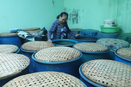 Một gia đình phường Hòa Hiệp Nam giới thiệu các công đoạn làm mắm của gia đình. - Ảnh: VGP/Lưu Hương