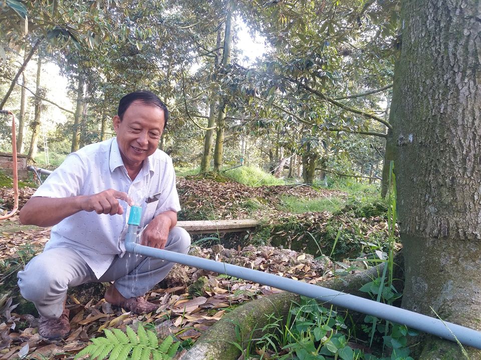 Nhà vườn Tiền Giang áp dụng giải pháp tiết kiệm nước tưới vườn sầu riêng. - Ảnh: VOV |