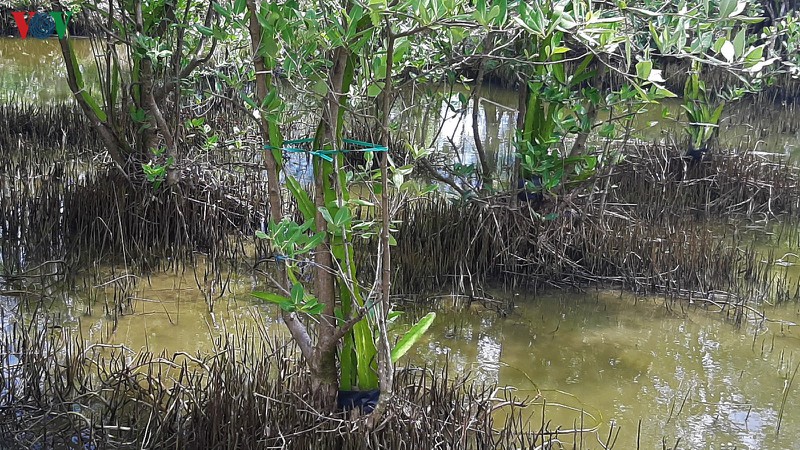 Ông Phương đã ươm giống và cho cây thanh long cộng sinh với cây mắm lớn lên ngay dưới tán rừng ngập mặn. - Ảnh: Trần Hiếu/VOV |