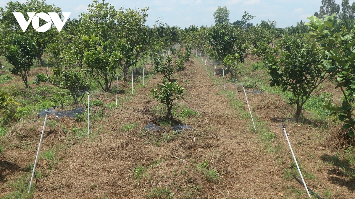 Một vườn trồng bưởi của nông dân Cù Lao Dung ứng dụng tưới tiêu tiết kiệm thông qua điều khiển bằng điện thoại thông minh. Ảnh: VOV